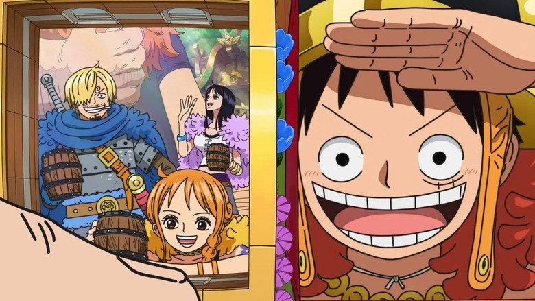 Overview: After hearing about Cracker's defeat, Big Mom creates a big storm before sending a massive army out to take revenge on Luffy. She then goes to meet with the Vinsmoke Family for lunch, and as they exchange pleasantries, Pudding asks Sanji via note to meet her in private later. Outside, Luffy, Nami, and King Baum watch as the enraged army heads toward them, but a steadfast Luffy refuses to move from his waiting spot.